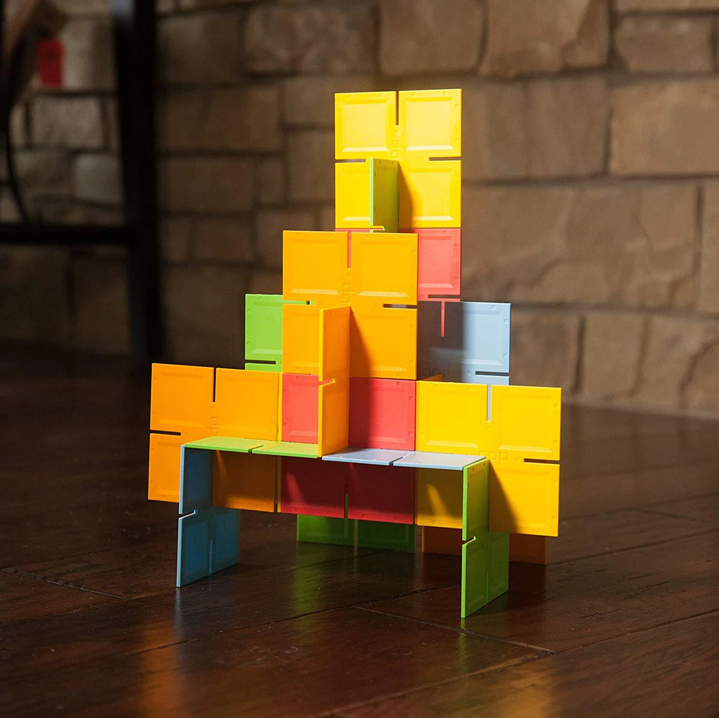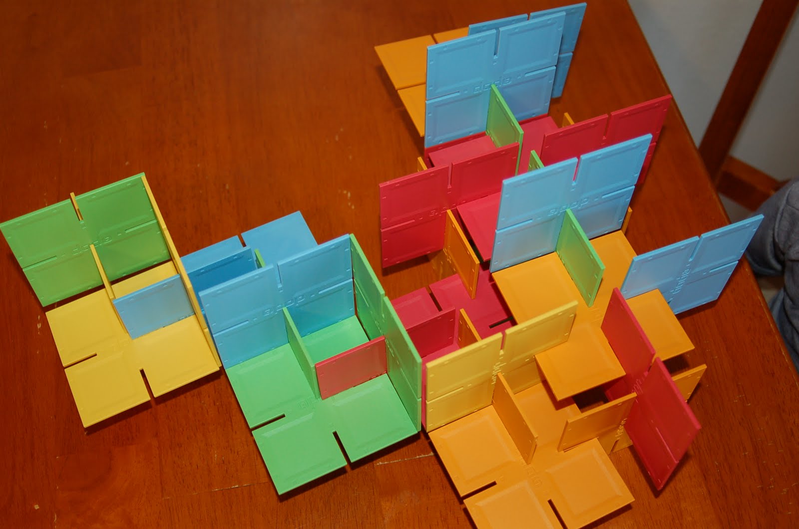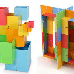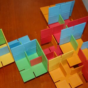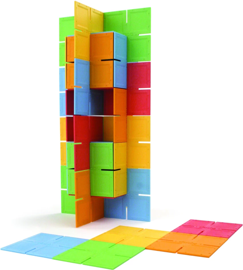 From 35 two-dimensional pieces, kids devise amazing three-dimensional designs. Given a few minutes with Dado Squares, they become parking garages for matchbox cars, fences for animals, angular hats, and space rockets. Designs are improvised and revised.